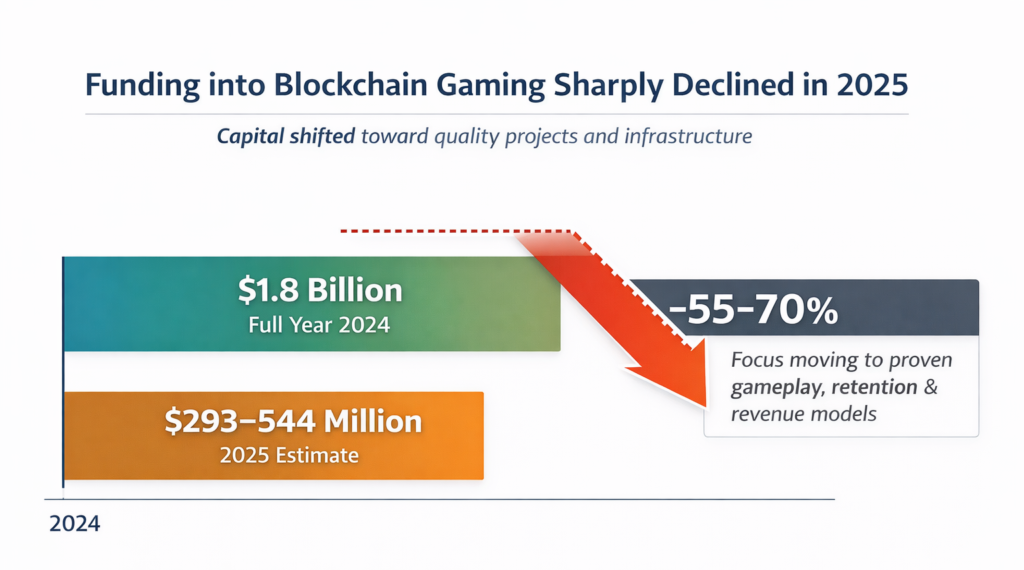 Blockchain Gaming Funding: Investment dropped from $1.8B to $293–544M (−55–70% YoY), signaling a shift toward quality projects, retention, and sustainable revenue models.