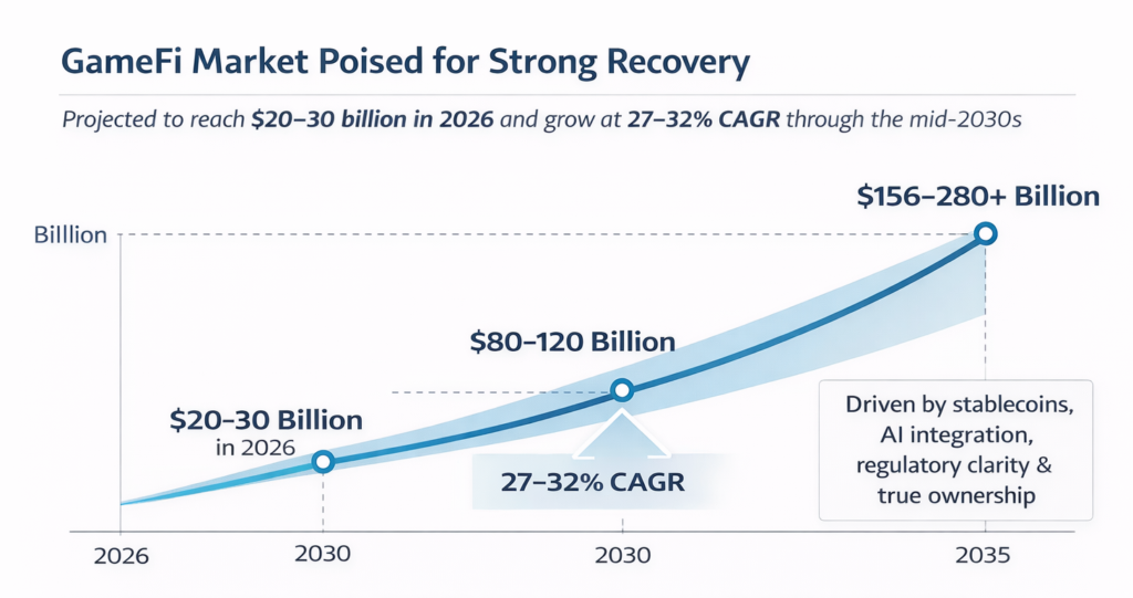 GameFi Market Outlook: Projected to grow from $20–30B in 2026 to $156–280B+ by 2035 at 27–32% CAGR, driven by AI, stablecoins, and real ownership.